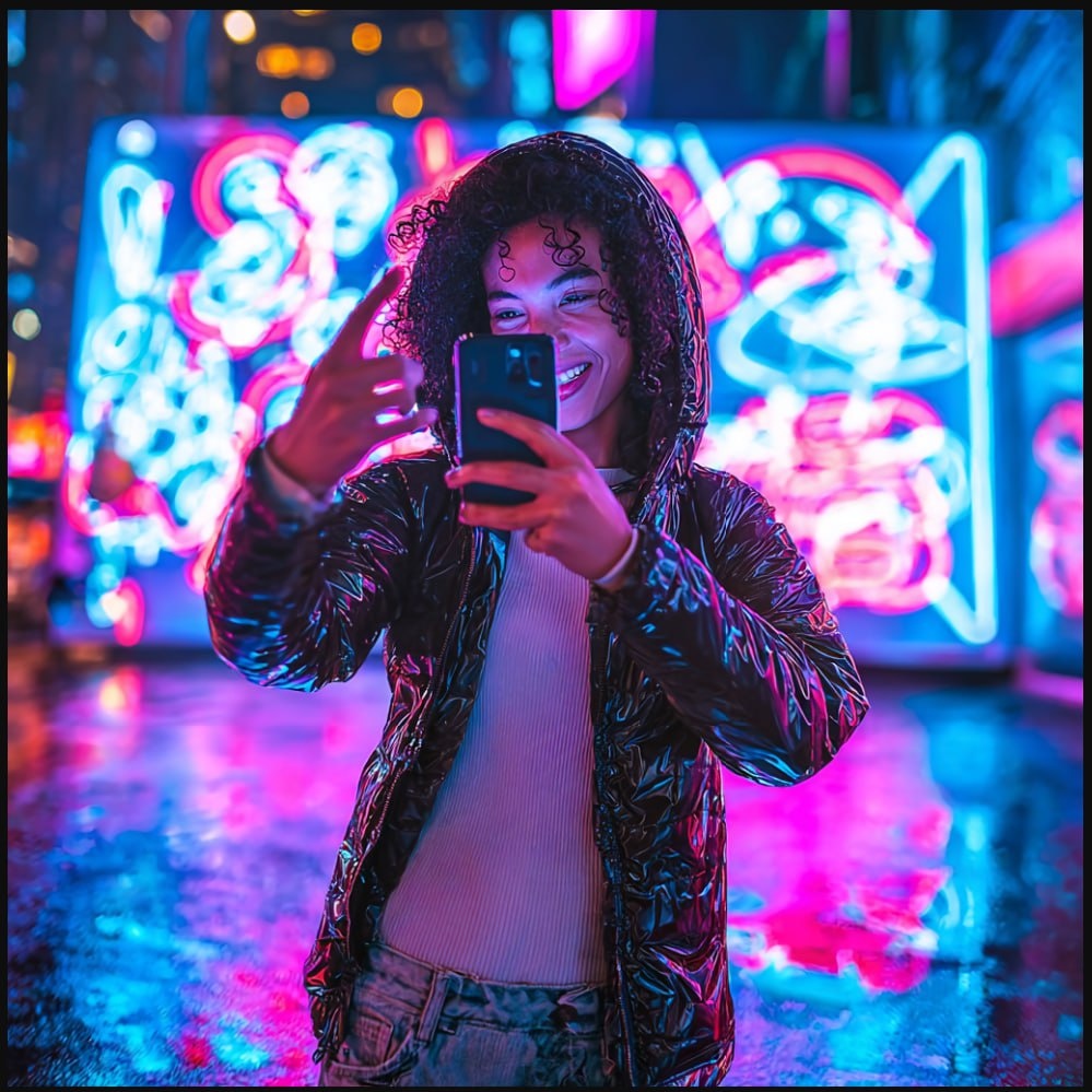 А неоновая «проявочная» лаборатория добавляет этому образу кинематографичности: фотограф не только фиксирует изображение, но и буквально формирует его, словно работает с живым светом.