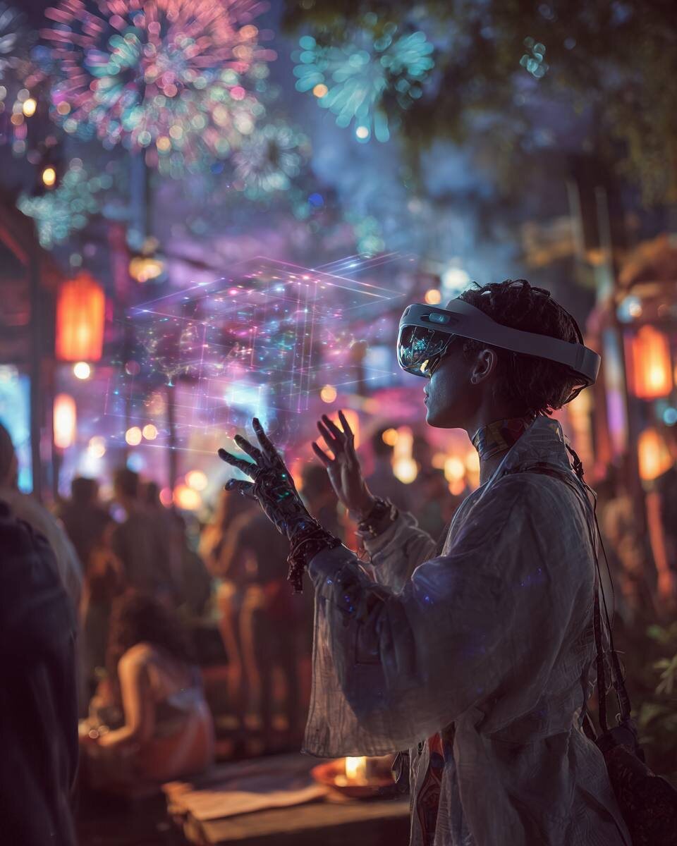 В одних работах фотограф предстает исследователем виртуальных вселенных — человеком, который легко погружается в VR и AR, создает кадры жестами, управляет светом, интерфейсами и голограммами так же естественно, как мы листаем галерею на смартфоне.