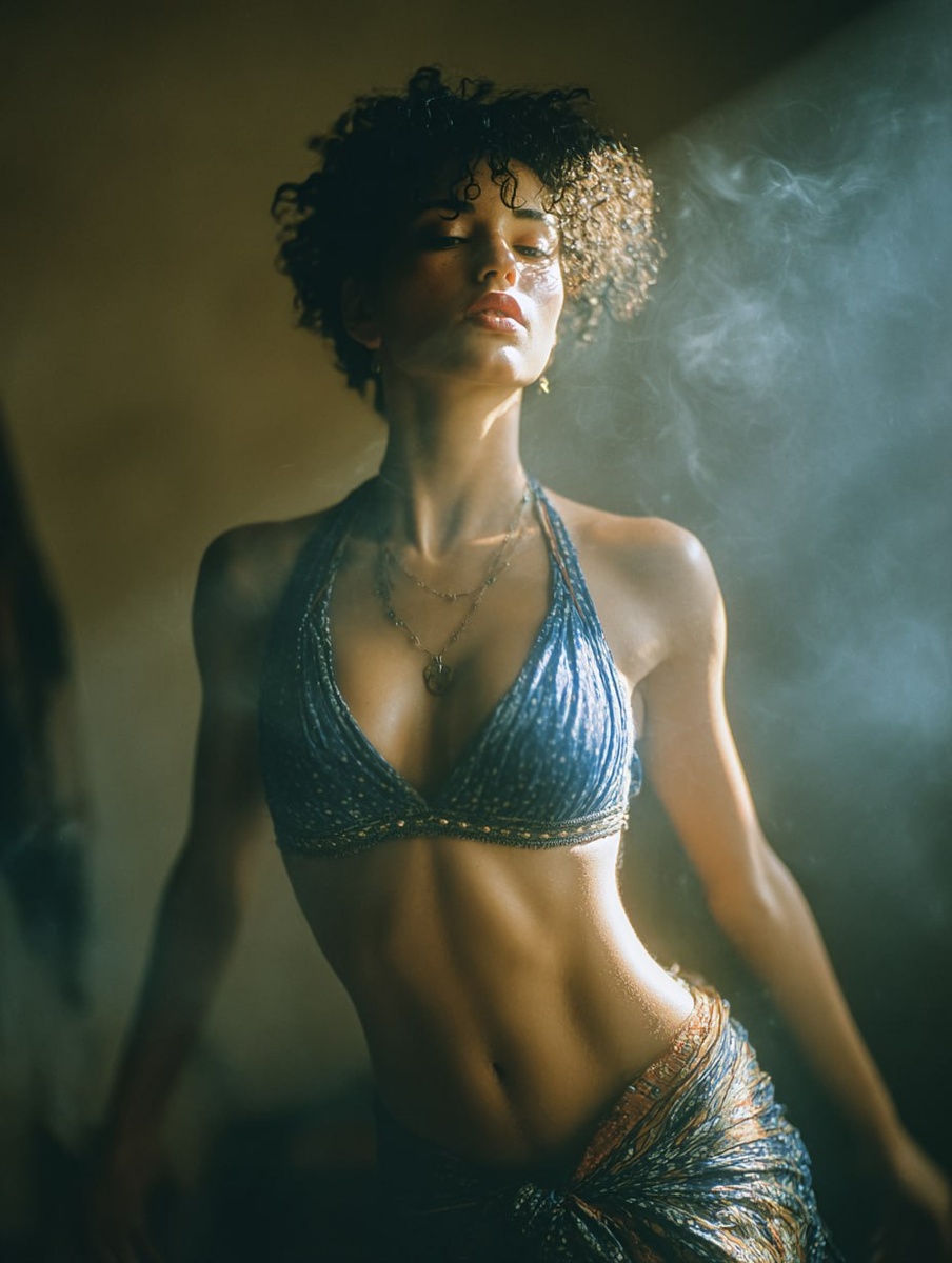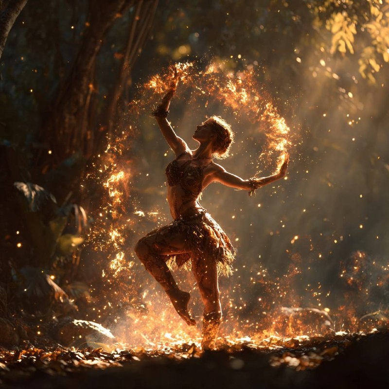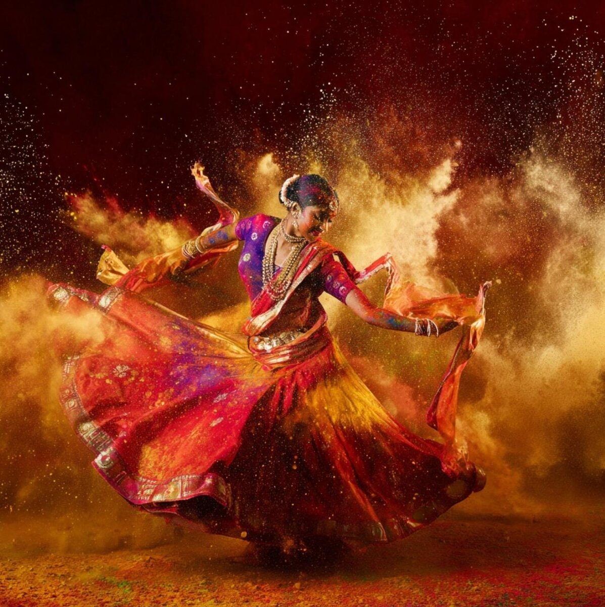 Он показывает танец в трех состояниях: как стихию, где пыль вспыхивает огнем вокруг тела. Как драму, где красное платье становится продолжением эмоции. Как молитва движением, где тонкая фигура в синем растворяется в вечернем свете.