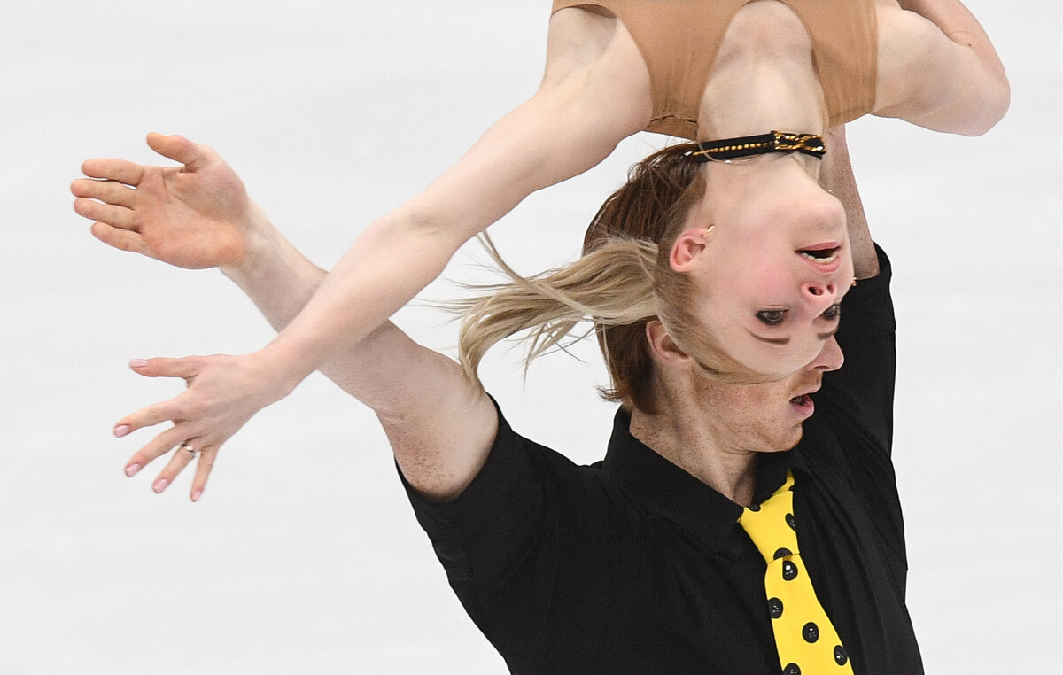 Евгения Тарасова и Владимир Морозов (Россия) выступают в произвольной программе парного катания на чемпионате Европы по фигурному катанию. 2018 год.
