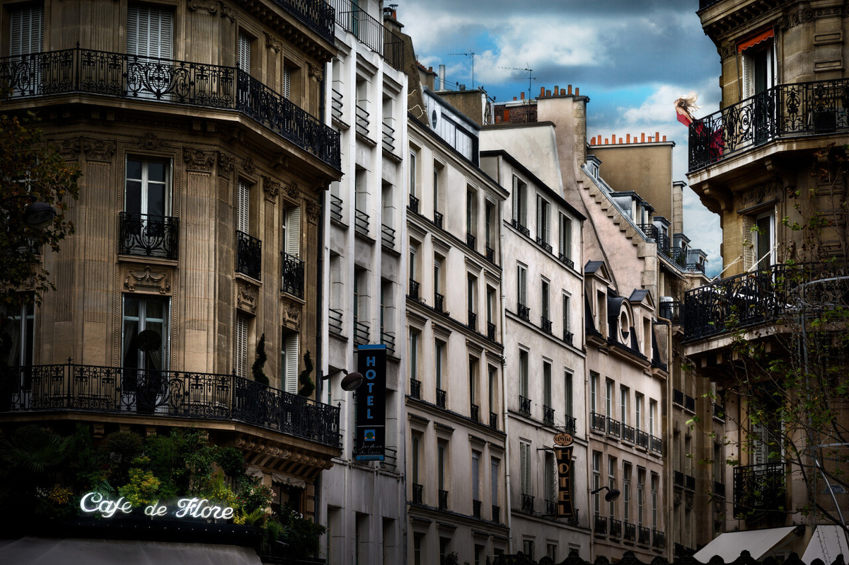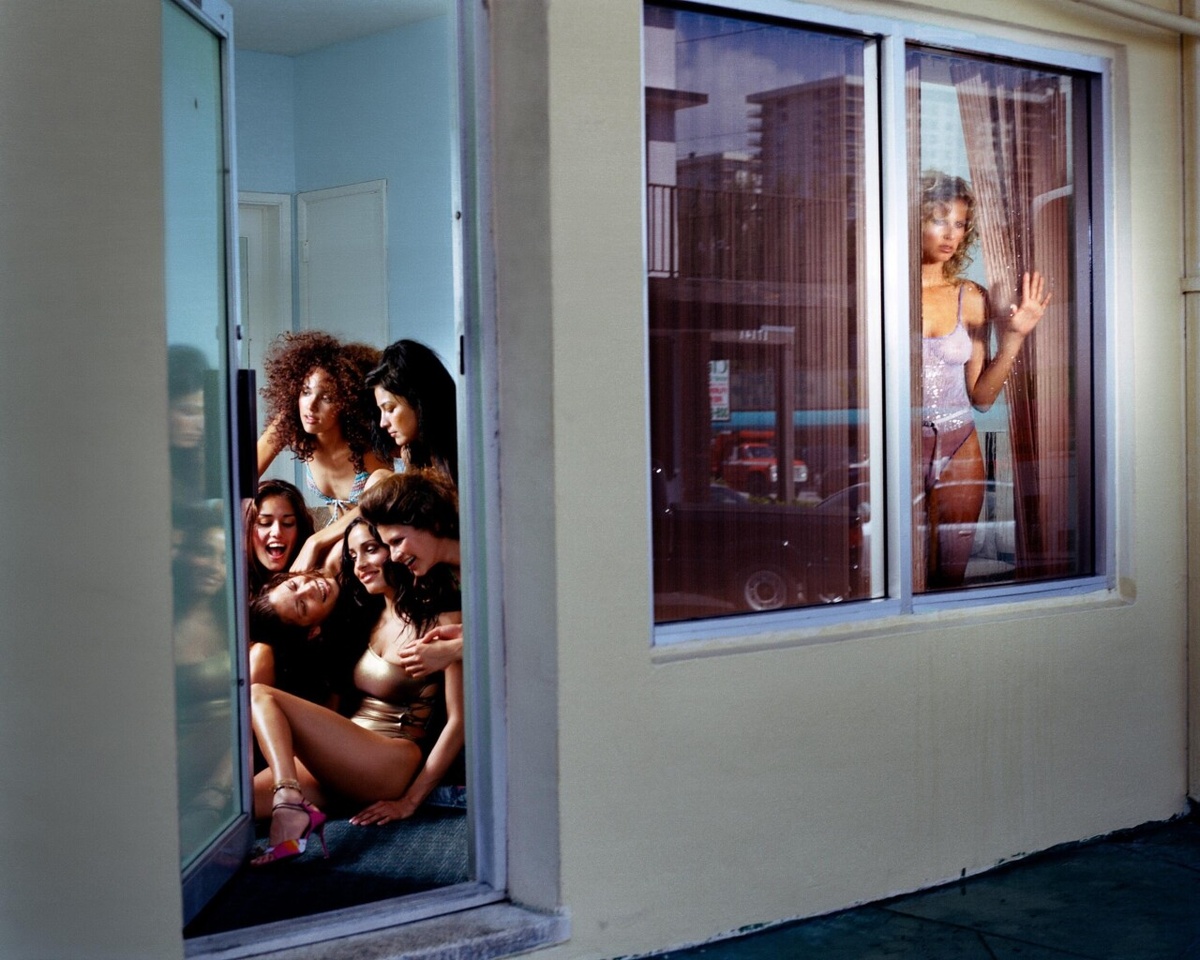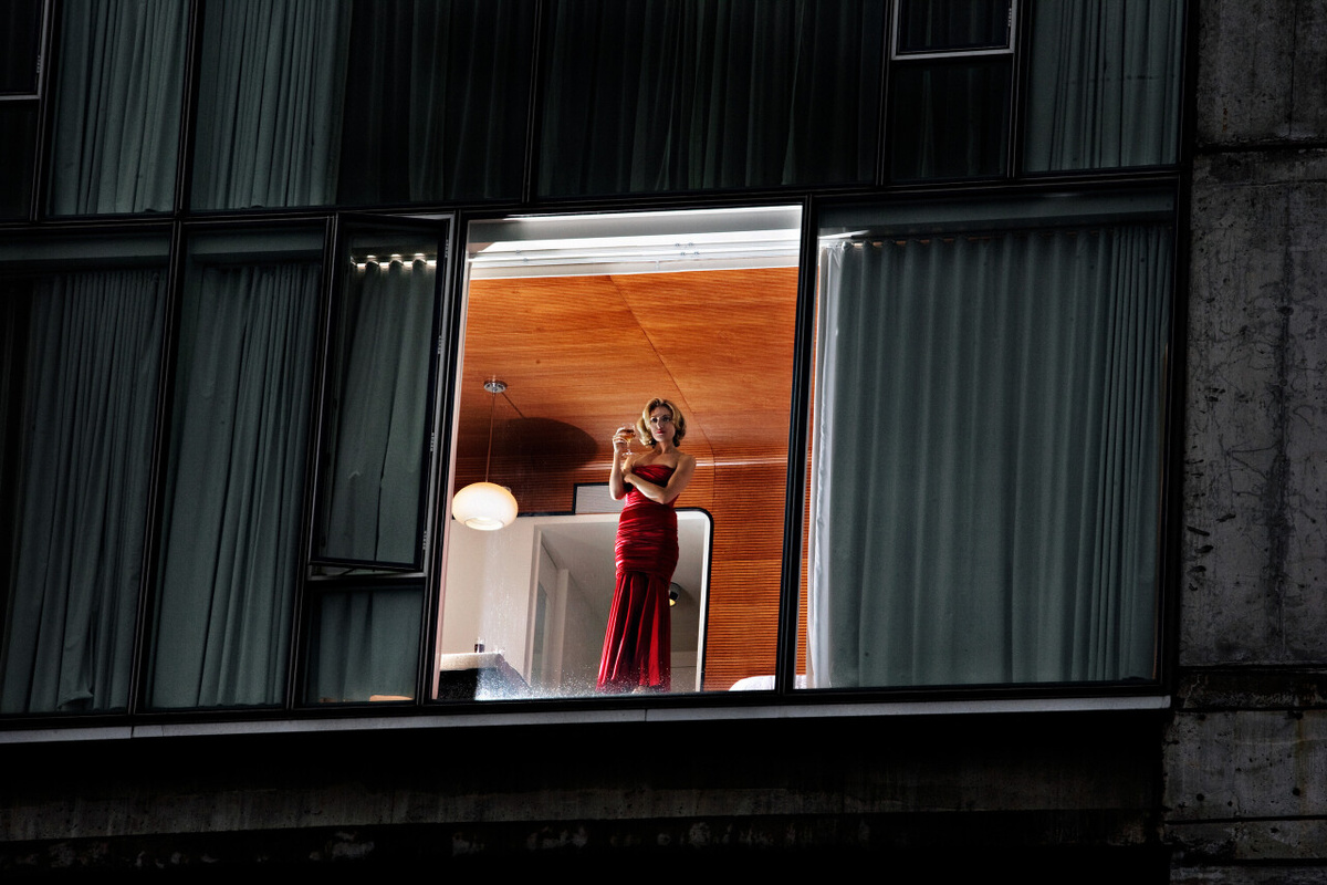 Одинокая девушка в красном платье в оконном проеме на фоне Эйфелевой башни («Девушка в Париже», проданная за $30 000) — кто она? Кого ждет или от кого только что ушел возлюбленный? Дребин мастерски создает двойственность и заставляет зрителя домысливать сюжет, чувствовать тревожность, унаследованную от Эдварда Хоппера, сквозь призму острой чувственности Хельмута Ньютона.