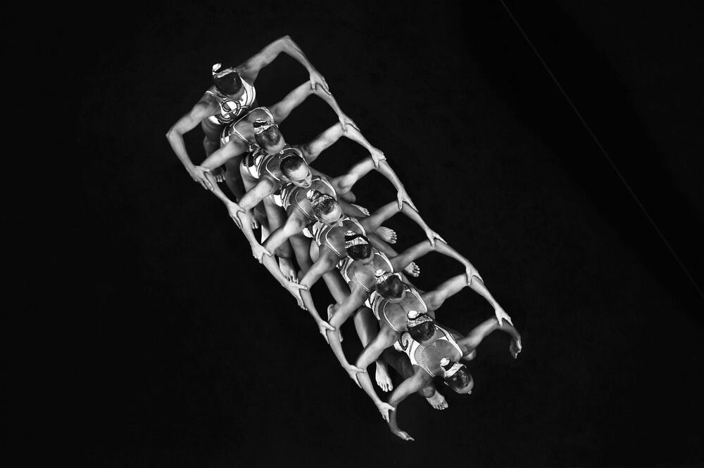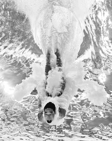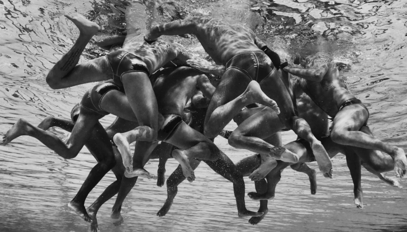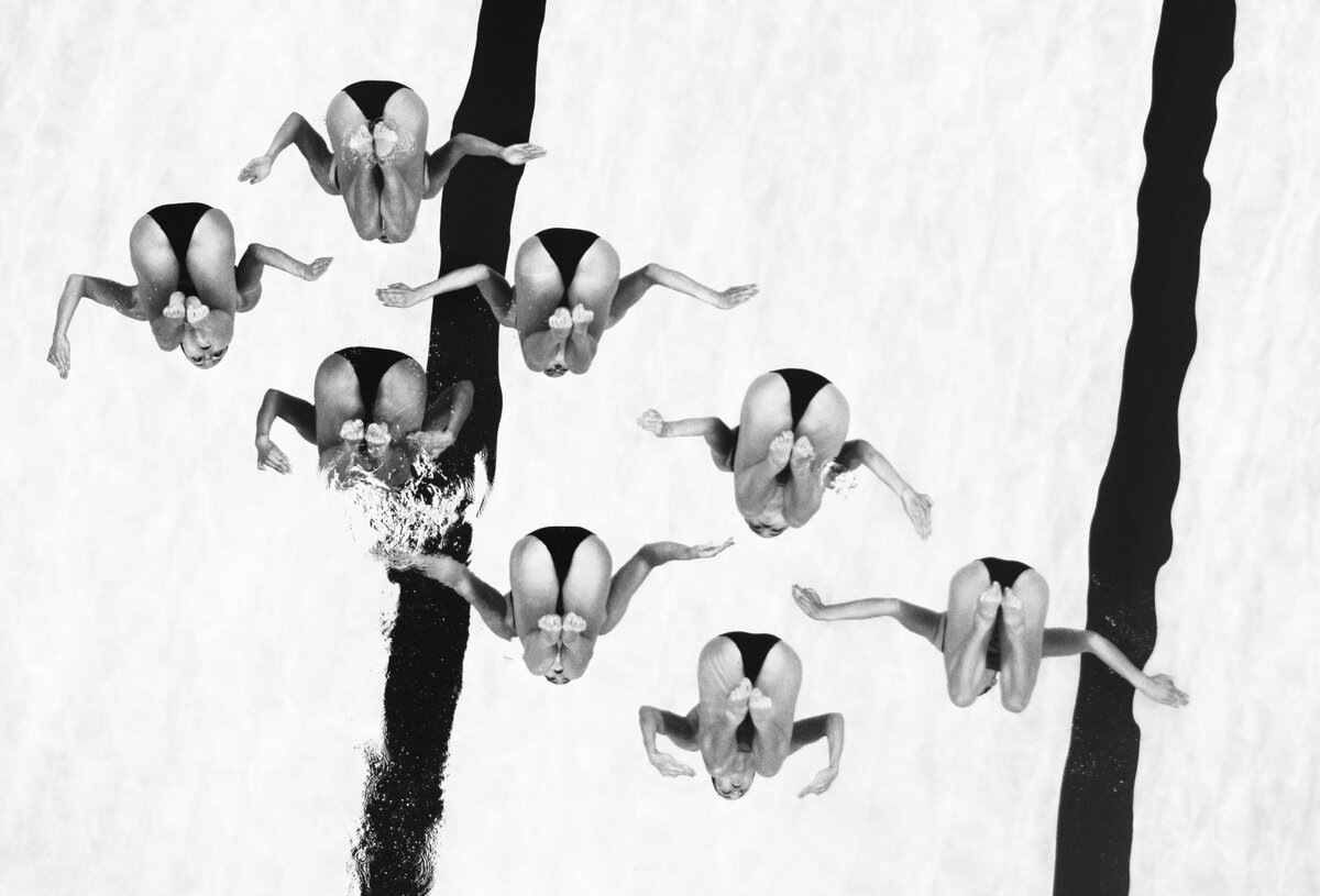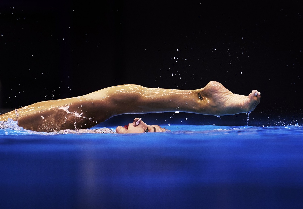 Именно поэтому его кадры выглядят так необычно. Мы почти никогда не видим спорт изнутри среды, в которой он происходит. Вода искажает пространство, ломает привычную гравитацию — и человек на фотографии становится не атлетом, а формой в движении. Почти абстрактной.
