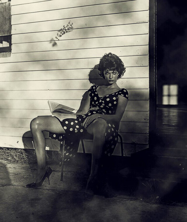 Главная особенность его работ — женщины в кадре не выглядят декоративными. Они смотрят прямо, жестко, уверенно. В его портретах много внутренней силы и даже вызова. Это не «красивый образ», это характер.