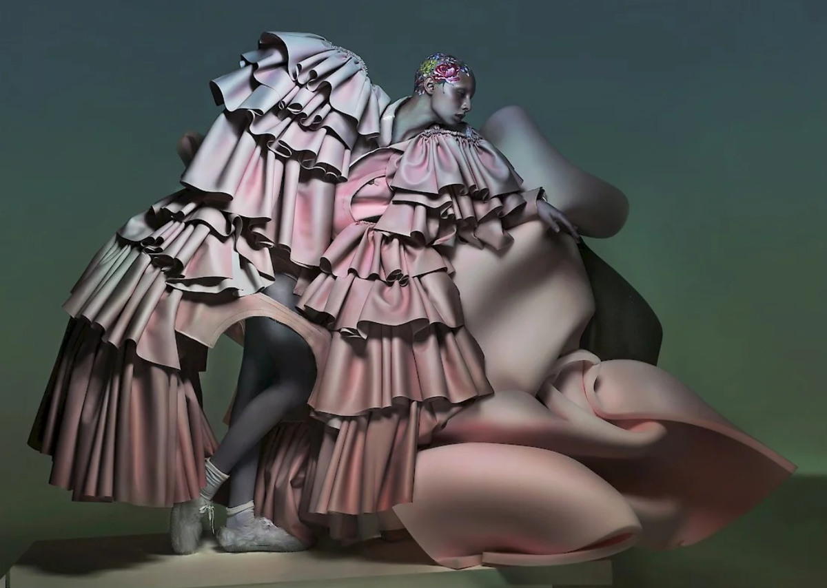 Для Найта одежда — это не просто ткань, это скульптура, которую можно растягивать, менять в цвете и заставлять левитировать в цифровом пространстве.